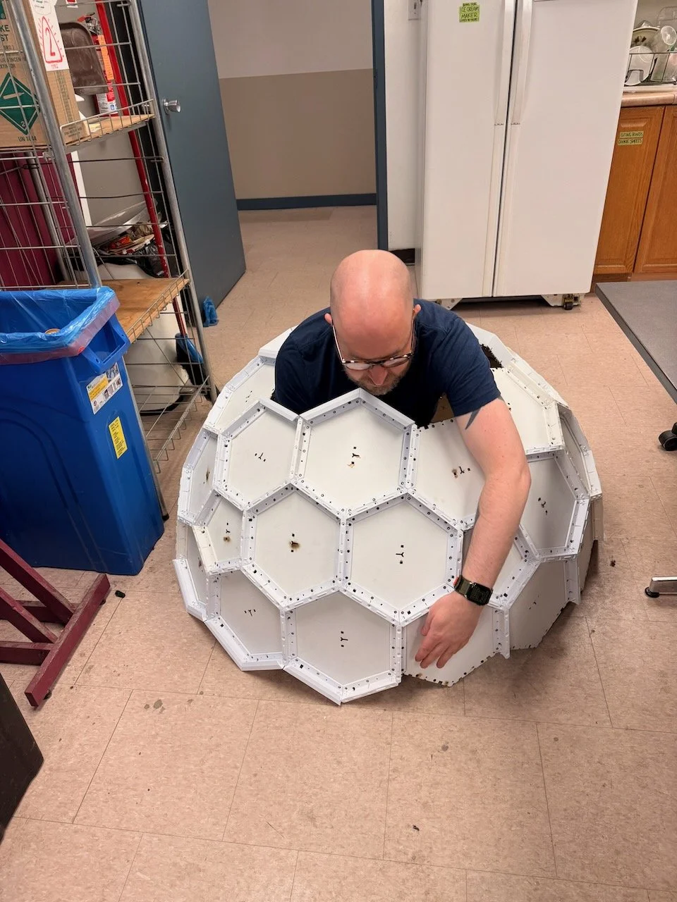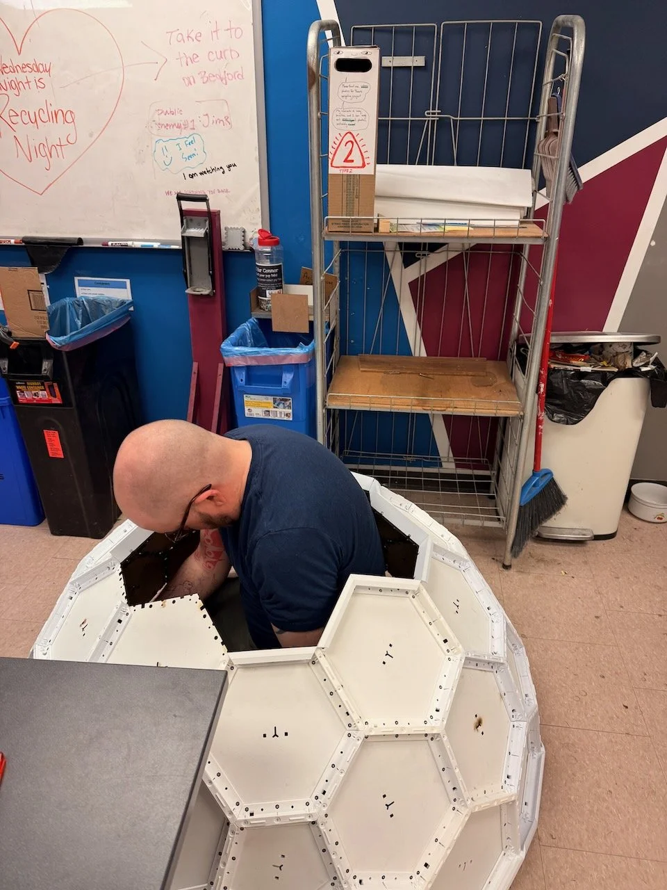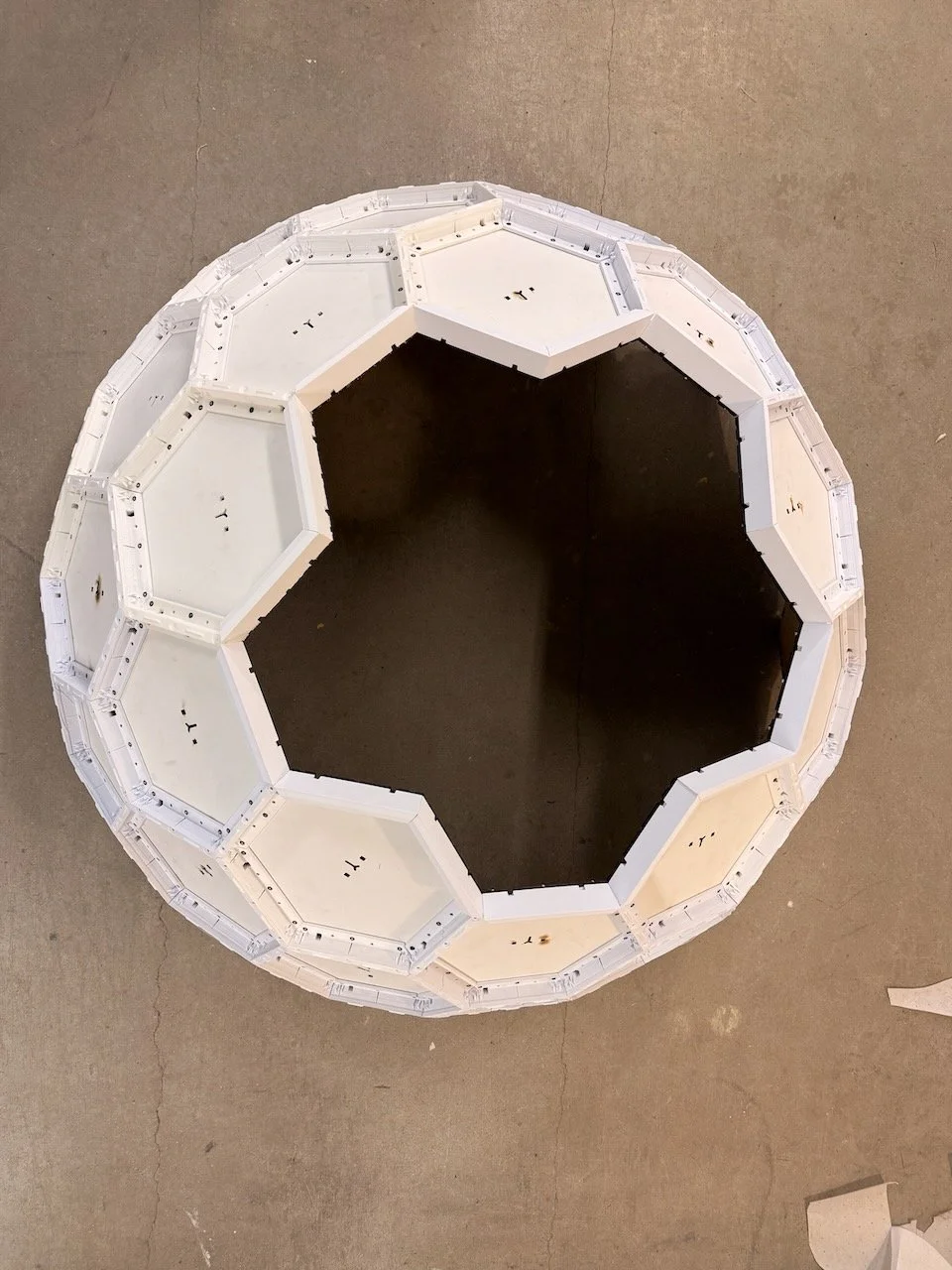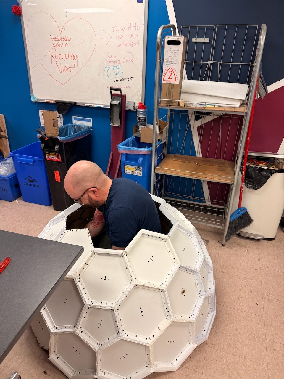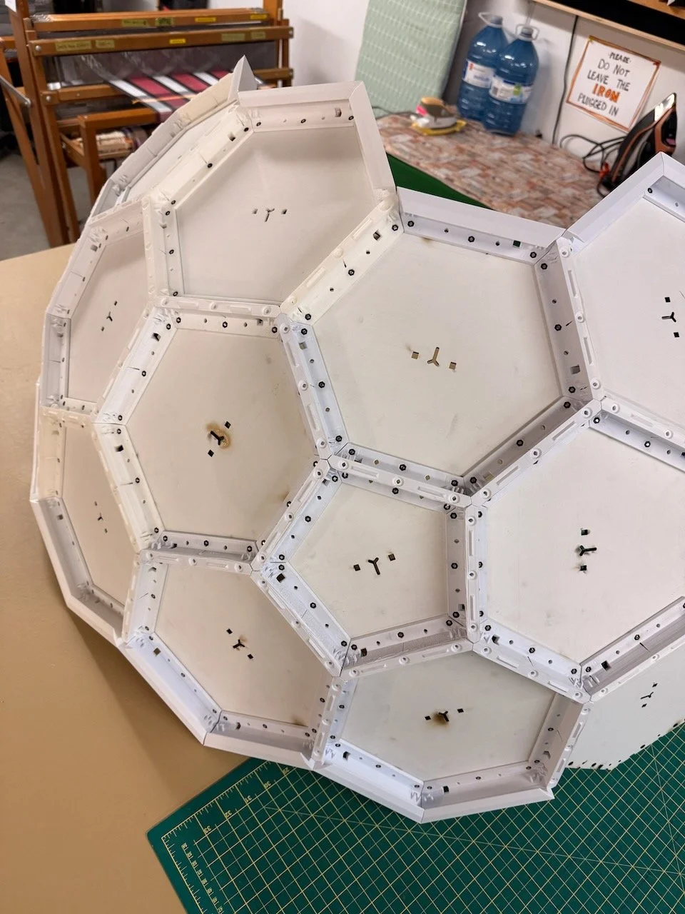 Here’s a short video of the moon under construction. We assemble the moon in panels of 8 cells. There are 10 total panels on the whole moon plus two additional panels on the top and bottom.