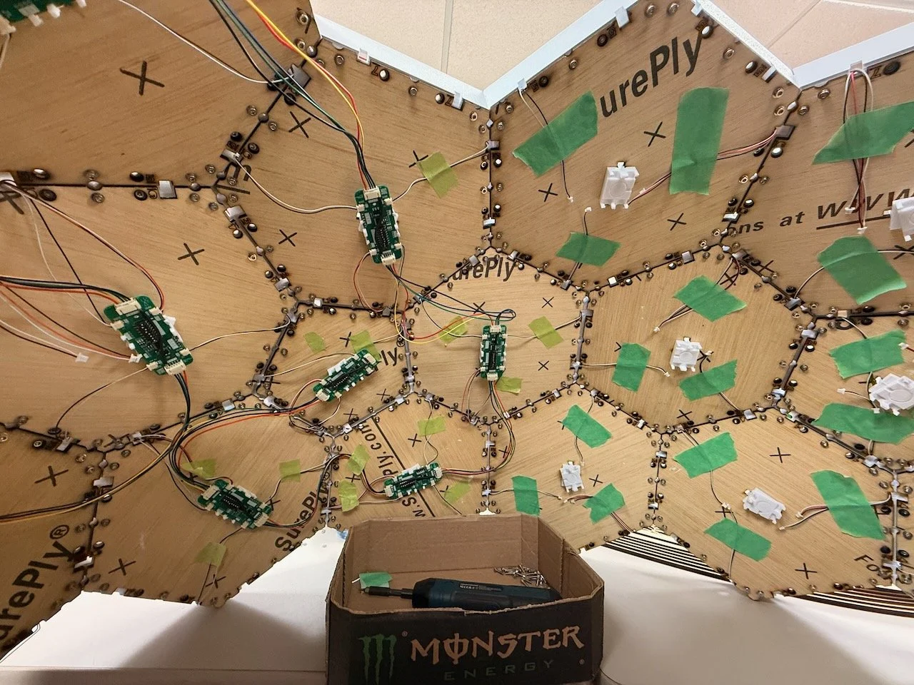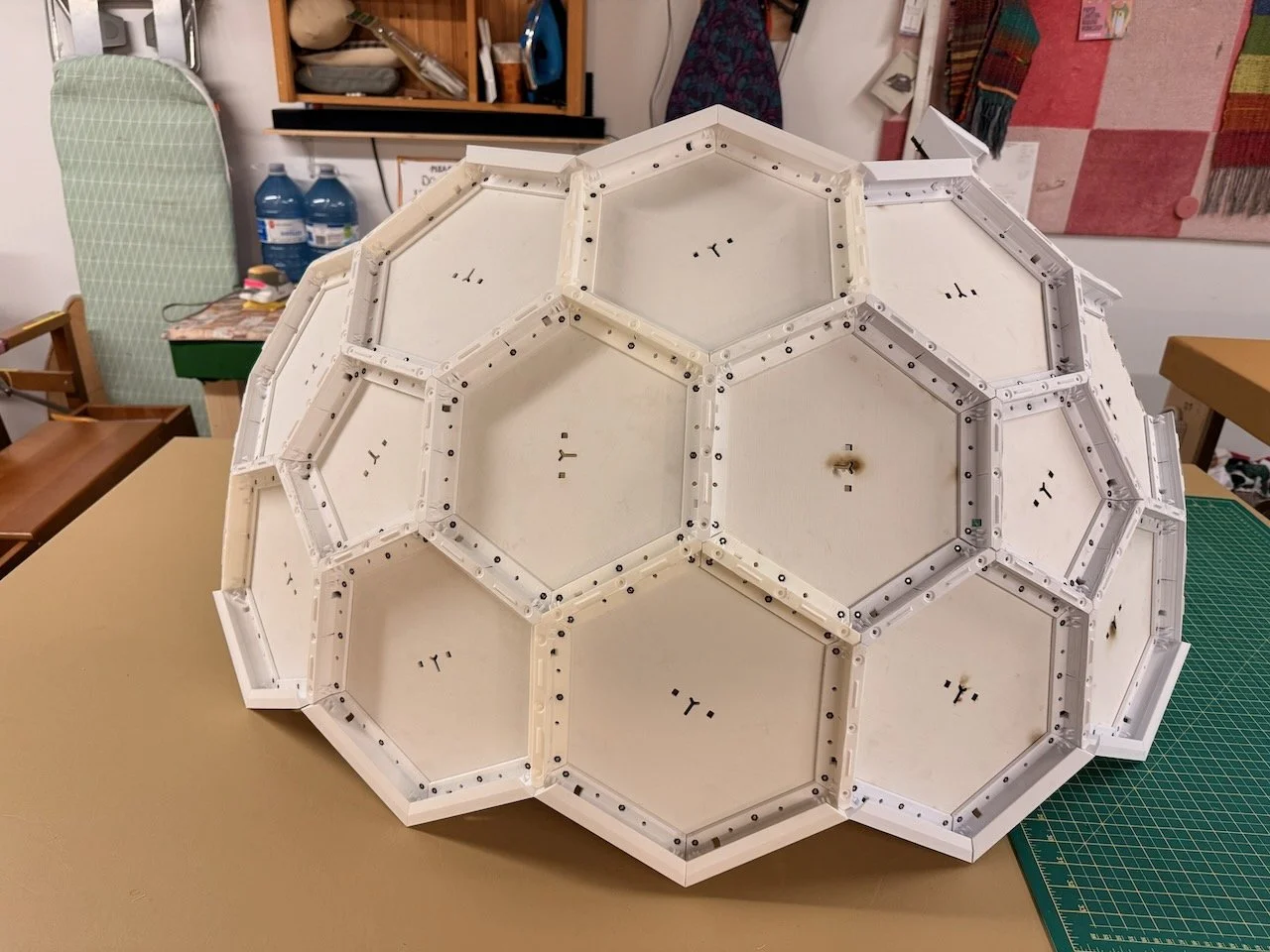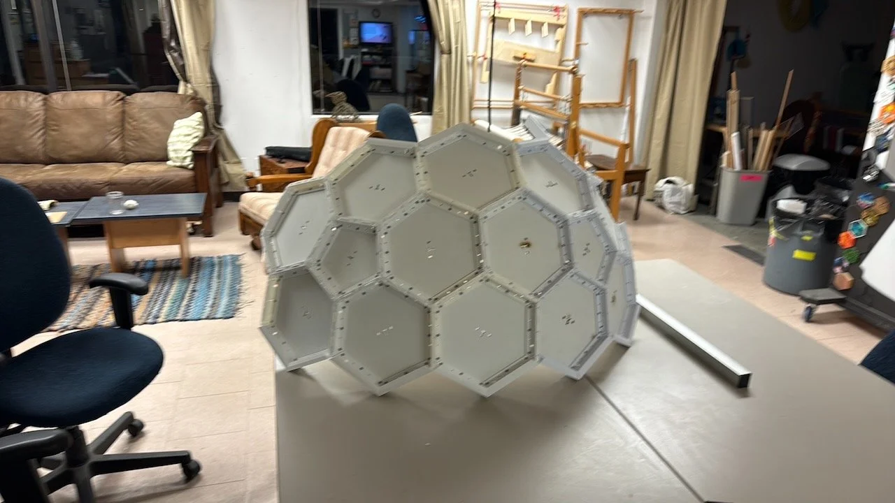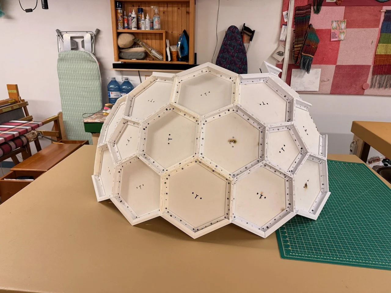 Here’s a short video of the moon under construction. We assemble the moon in panels of 8 cells. There are 10 total panels on the whole moon plus two additional panels on the top and bottom.
